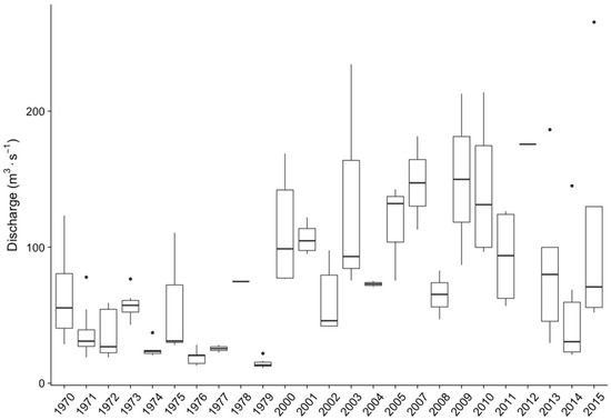 Ice-induced peak discharges before regulation (winters 1970/1971–1979/1980) and after regulation (winters 2000/2001–2015/2016). The bold line is the median, the box shows the interquartile range(IQR), the whiskers 1.5 · IQR, and the circles show outliers.