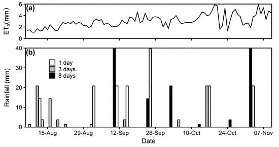 A simulated rainfall experiment was conducted over 89 days (9 August to 3 November 2011) in a rain-out shelter at The University of Melbourne’s Burnley campus, Melbourne, Australia (−37.828472, 145.020883). We measured applied rainfall, retention, and runoff from simulated rain events to close the mass balance. Daily reference evapotranspiration (ETo; calculated as per Allen et al. [35]; Figure 1) was derived from patched-point SILO data [36] for the Melbourne Regional Office (site 086071; Australian Bureau of Meteorology, 3 km from the study location).