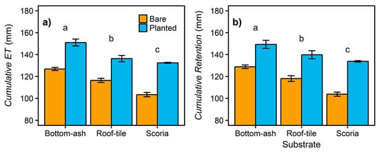 Cumulative evapotranspiration and retention for the experimental period. (a) Mean (±standard error, n = 3) Cumulative ET (evapotranspiration) and (b) mean (±standard error, n = 3) Cumulative Retention for each substrate and vegetation cover type. Different letters denote significant difference among substrates, rather than between vegetation cover types (both p < 0.001).