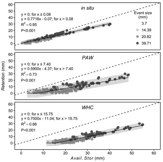 Broken-stick (MARS) models described the relationships between available storage (Avail. Storin situ, Avail. StorWHC and Avail. StorPAW) and Retention well for events >1.32 mm (all p < 0.001; Table S1). Figure 3 shows the broken-stick models for Avail. Storin situ, and each event size shows two distinct regions: (i) an initial, steep and positive relationship where Retention was likely not limited by the event size, and (ii) a subsequent plateau where Retention no longer increased with available storage, most likely because Retention was limited by event size.