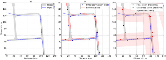 The pipe network is applied next. As shown in Figure 2c, a 20 m buffer is created around the entire pipe network. Any storm drain inlet that is located outside the 20 m buffer will be discarded (Figure 2c). Synthetic storm drain inlets in the final layer therefore meet the following conditions: they are located inside the road polygon, 0.25 m inside the kerb and 50 m apart from each other, and they are within 20 m of the pipe network.