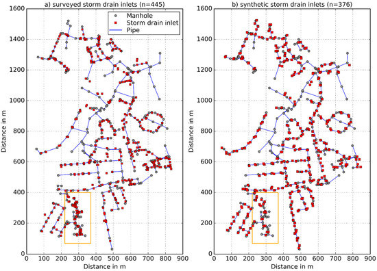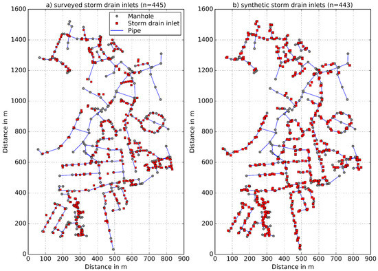 Surveyed storm drain inlet network (a) and synthetic storm drain inlet network final version (b).