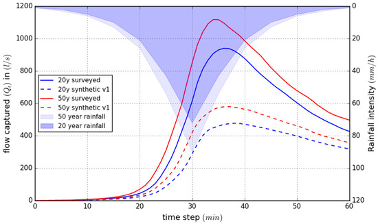 The network drainage efficiency has been assessed by calculating the inflow volumes for the network at each time step in CityCAT. The initial network, with fewer storm drain inlets and not specifically accounting for ponding areas results in a clear under-representation of the captured flow (Qi) by the storm drain inlets (Figure 4). The flow captured (Qi) represents the portion of flow entering the storm drain inlets and is the difference between the flow approaching a storm drain inlet and the pass-over flow [19]. The graph in Figure 4 shows the total volume of water that is drained by all storm drain inlets for the synthetic and surveyed storm drain inlet networks for both of the storm events. Figure 4 not only shows an under-representation of the captured flow, but also a later onset of drainage when comparing the synthetic storm drain inlets with the actual ones.
