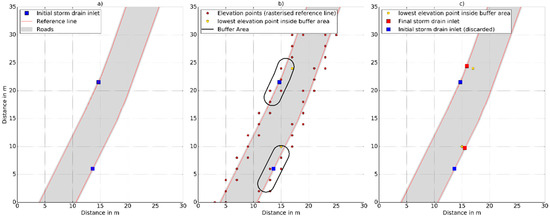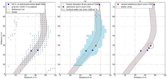 In a first step, all of the cells with an inundation depth ≥0.05 m were merged together to form continuous polygons (Figure 7a,b). Any polygon with an area < 200 m2 and not intersecting with the reference line were discarded. For each polygon left the lowest terrain point inside the road polygon was identified (Figure 7b). The threshold values of 0.05 m and 200 m2 are thought to be a reasonable combination to reflect the actual surface water ponding areas and not being misguided by potential erroneous terrain data. Subsequently, at the shortest distance between the lowest terrain point and the reference line, an additional storm drain inlet was placed (Figure 7b). Around this storm drain inlet, a buffer with a distance of 150% of the terrain resolution was created (Figure 7c). At the lower lying intersection point of this buffer line with the reference line a second additional storm drain inlet was added (Figure 7c). Adding a second storm drain inlet aims to reflect so called twin-gullies, which are commonly installed in sag locations [26].