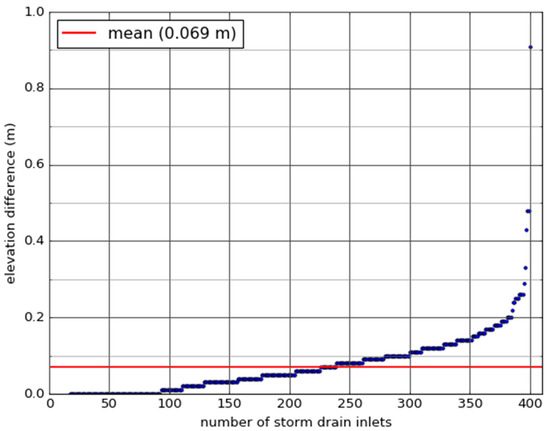 Overall, the differences in surface water depth mostly range between −0.01 and 0.01 m, respectively. Areas with a difference in surface water depth beyond −0.01 m and 0.01 m are scattered across the entire catchment. For a majority of those areas, the absolute difference in surface water depth is within 0.05 m. On a catchment level, the results shown in Figure 10 can be considered satisfactory in terms of the surface water drainage that is achieved by the synthetic storm drain inlet network. The results also underline the significance of storm drain inlets that are situated in surface water accumulation areas. At the same time, this highlights the critical aspect of over-estimating the number of synthetic storm drain inlets added in surface water accumulation areas.