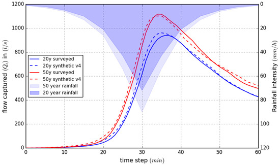 In comparison to the preliminary results (Figure 4), the final synthetic network model shows a significant improvement (Figure 9) in terms of the drainage efficiency when compared with the surveyed network model, in terms of both the total volume drained and the shape and timing of the inflow hydrograph (Qi). The results shown in Figure 9 highlight the significance of the adaptions that were made to the GIS routine and especially the incorporation of terrain information to re-position the inlets. As described earlier, the average elevation difference between the initial and adjusted storm drain inlet of 6.9 cm was relatively small, suggesting that together with the 42 storm drain inlets added in surface water accumulation areas, the system drainage performance is quite sensitive to small scale topographical changes and positioning. These issues are also highlighted in other studies [38,39].
