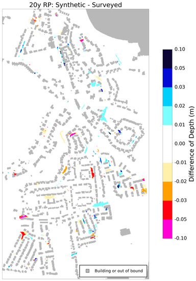 The final results that are presented investigate the impact of the different storm drain inlet networks on the surface water inundation depth. The map in Figure 10 was produced by subtracting the maximum surface water grid obtained for the simulation using the surveyed storm drain inlet network from that using the synthetic network. Only the results for the 20-year storm event are presented.