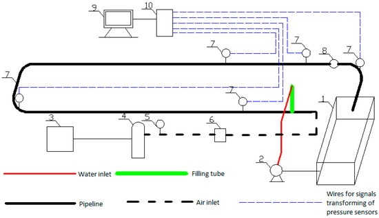Two-phase pulse flushing experiment set up: (1) water tank; (2) water pump; (3) wir compressor; (4) gasholder; (5) pressure control valve; (6) pulse generator; (7) pressure transmitter; (8) flow meter; (9) computer; and (10) data acquisition module.