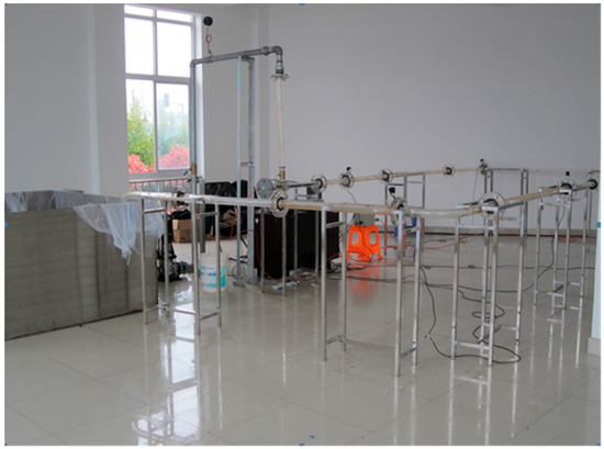 The experiment set up scheme is shown in Figure 1, and Figure 2 is the practical experiment set up in the lab. The material of the pipes used for this experiment is polymethyl methacrylate. The pipes are connected by flanges. The internal diameter of the pipes is 40 mm, and the external diameter is 60 mm. The size of the water tank is 2000 mm × 2000 mm × 1000 mm. The framework consists of a circulatory water supply system, an air supply system, an experimental pipe line with feeding device and a data acquisition system.