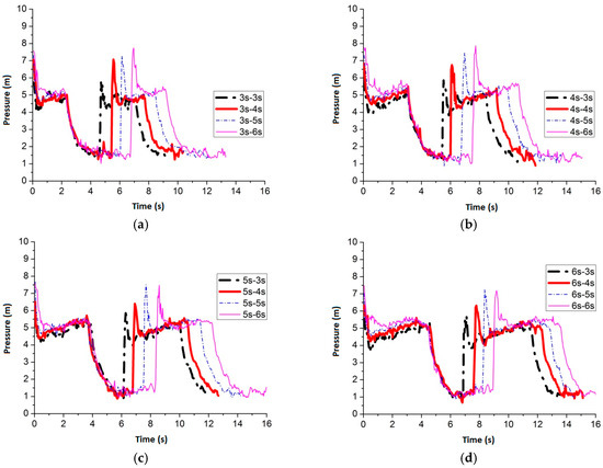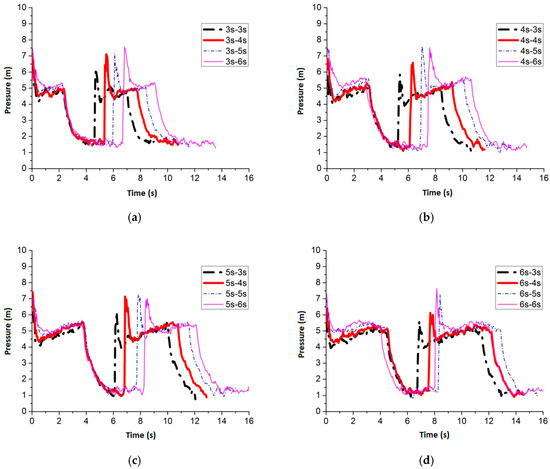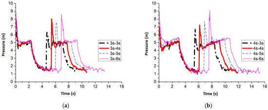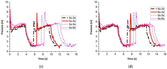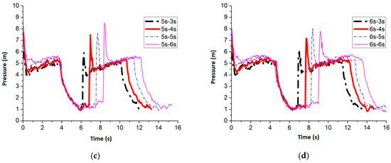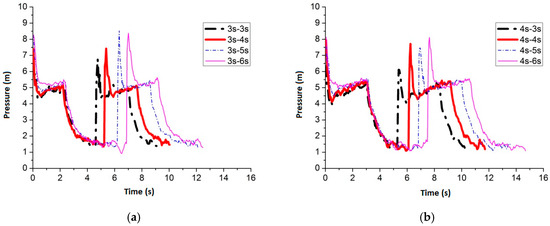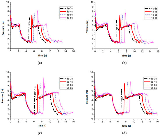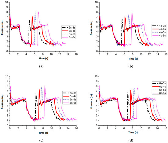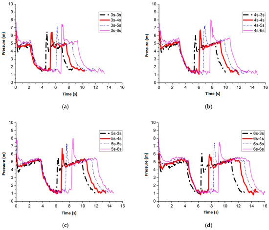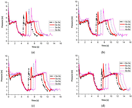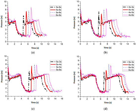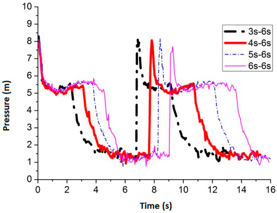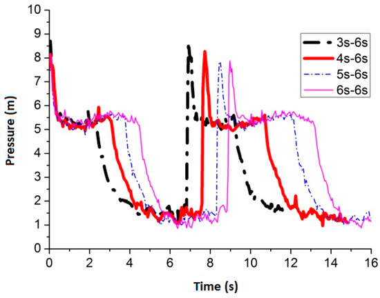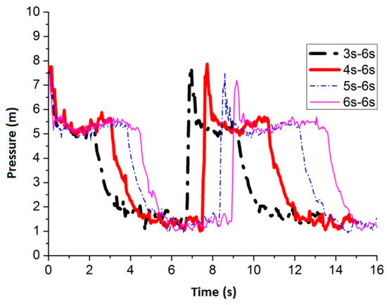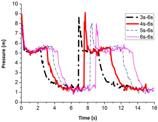 Figure 24 shows the maximum average peak pressure comes after air inflow is cut off for 6 s by setting the air inflow time invariant. When the frequency is 3 s–6 s, 4 s–6 s, 5 s–6 s and 6 s–6 s, the average peak pressure is 7.51 m, 7.44 m, 6.99 m and 7.47 m, respectively. Figure 25 shows the pressure comparison of the four best frequencies. When air cut off duration is 6 s, few differences are caused by pulse frequency by applying different air inflow time. When the frequency is 3 s–6 s, the peak pressure reaches maximum, which is 7.51 m, when the slot nozzle is set on top of the pipe.