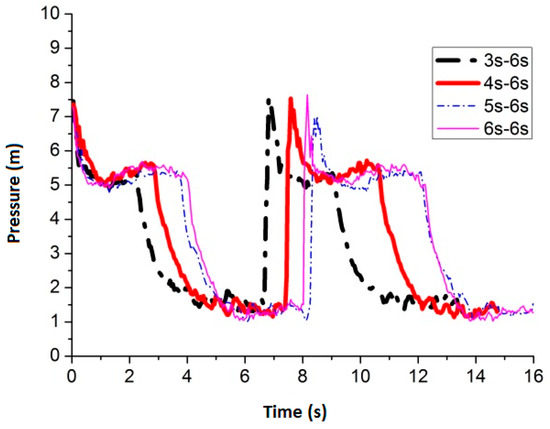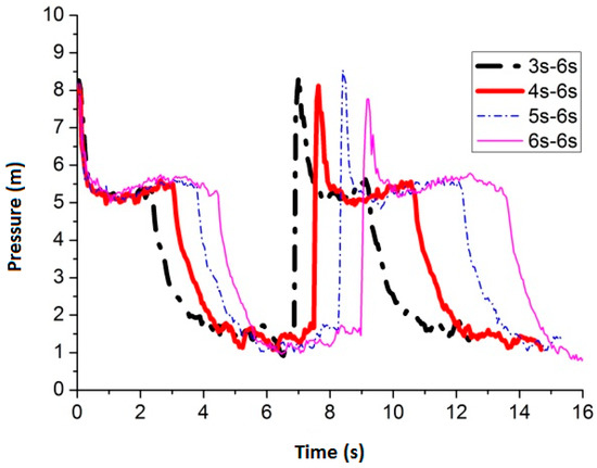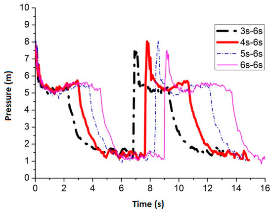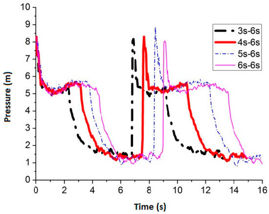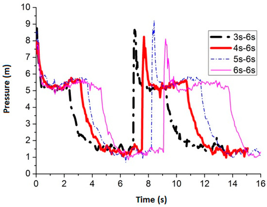 Figure 9 shows the maximum average peak pressure comes after air inflow is cut off for 6 s by setting the air inflow time invariant. When the frequency is 3 s–6 s, 4 s–6 s, 5 s–6 s and 6 s–6 s, the average peak pressure is 8.74 m, 9.03 m, 8.00 m and 7.88 m, respectively. Figure 10 shows the pressure comparison of the four best frequencies. Few differences are caused by pulse frequency by applying different air inflow time after air inflow is cut off for 6 s. When the frequency is 4 s–6 s, the peak pressure reaches the maximum value 9.03 m (round nozzle at the bottom of the pipe).