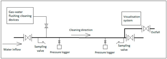 Based on the experimental results in Section 2, the best flushing condition combination is to set the round air inflow nozzle at the bottom of the pipe operating at the frequency 4 s–6 s. The results are verified by numerical modelling and experiments. Therefore, this case project uses these results. However, the experimental pipeline is aclinic but the pipeline used in this case project consists a bridge duct which is 14 m higher than the ground and its length is 200 m. The structure in this pipeline is more complex than the experimental one. Hence, based on the optimum combination, by using the visualisation system at the end of the pipeline outfall to monitor the flushing results in real time and adjusting the frequencies at the beginning of the pipeline, the optimum flushing results are guaranteed.