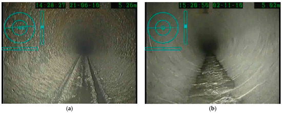 Photos inside the pipe to show the flushing effect in this case study: (a) before flushing; and (b) after flushing.