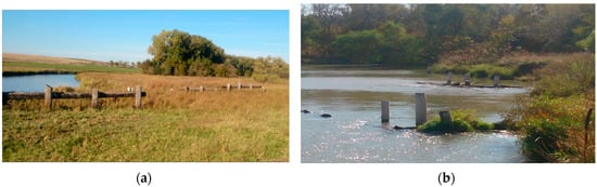 Alluvial channels continue to adjust, change, and sometimes shift their location [9]. In some eroding stream reaches, the streambanks are stabilized using conventional or modified stabilization techniques. Such stabilization structures are typically implemented in an effort to lock the stream channel into a relatively fixed location and condition [9]. The channel bank infrastructure then alters the geomorphic processes and can lead to more erosion at the stabilized site as well as at locations upstream and downstream [10,11]. When these channel migration processes are ignored, the erosion-control structures may become ineffective over time, causing failure during large flow events [2,9,10]. Rosgen [12] has restored and monitored over 48 km of rivers and has monitored various structures’ performance following major floods. The results contradicted the expected pattern, as many structures caused river instability.