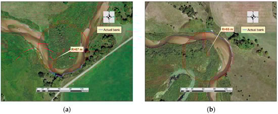 The left image (a) shows the radius of curvature of the stabilized bank (Site 4) in 2016; the right image (b) shows the radius of curvature of one of the three control sites for Site 4 (The radius was 64 m in 1993). Note that both sites have cropland on the outer bank and dense trees on the inside bank. The flow direction is from left to right.