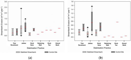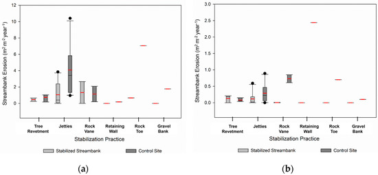 Boxplots illustrating the streambank erosion rates for the pre-stabilization (a) and post-stabilization (b) periods for the stabilized streambanks and control sites. Red lines indicate the mean erosion rates.