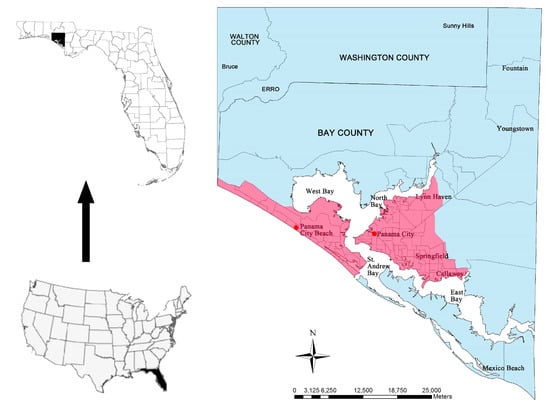 To validate proposed hypotheses, face-to-face interviews guided by a structured questionnaire (in Supplementary Materials) were conducted in the City of Panama and Panama Beach in Bay County, Florida (USA) (Figure 1). Bay County lies in the northeastern part of Florida and is consistently threated by storm surge, hurricane, and other coastal hazards. Since 1877 it has been stricken by more than fifteen major hurricanes that resulted in huge economic loss and fatalities [44]. Increasing exposure to flooding, combined with recent land development, makes this region extremely vulnerable to sea level rise.