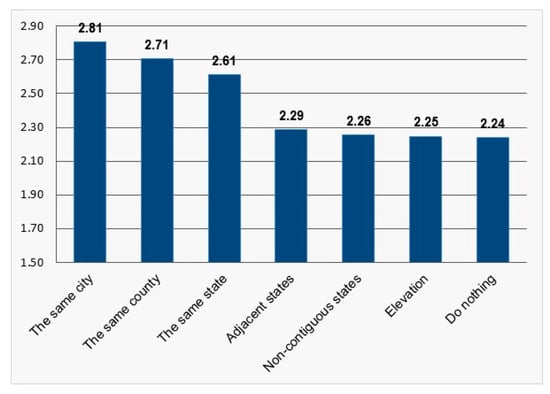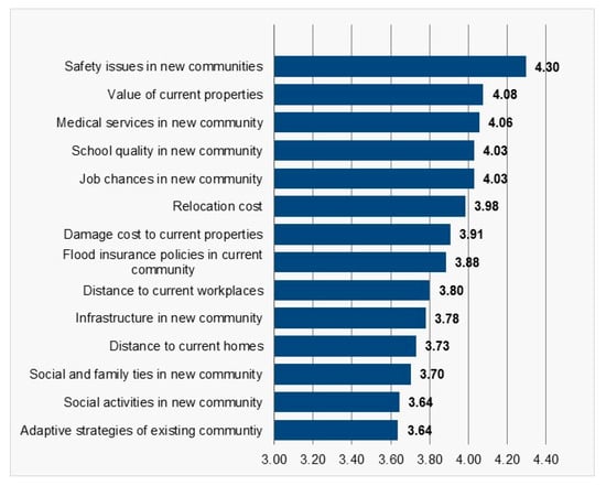 It has been suggested that coping appraisal is a better predictor for mitigating behaviors than threat appraisal [32,34]. Figure 2 appears to show such a pattern since four out of the five items with the highest scores represent coping appraisal. In anticipation of invisible threats such as sea level rise, people have many other economic and livelihood priorities—apart from the relocation option. Surprisingly, the survey shows that the respondents rank safety issues in new communities as the most crucial factor (4.30) when they consider relocation choices. This is in line with Graham et al. [49] who concluded that people when faced with sea level rise adaptation options, attached a high value to the feeling of safety. Another important aspect is the value of current properties (4.08). The abandonment or resale of a high-value property is always a difficult decision. Additional critical factors relate to the medical (4.06) and educational (4.03) aspects of new communities, followed by job opportunities (4.03). However, adaptation strategies in existing communities are the least considered items. This may be due to a lack of public awareness of local adaptation efforts.