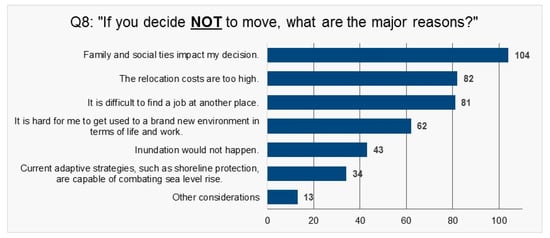 One hundred and four respondents claim that family and social ties make them unwilling to relocate (Figure 4). A lack of economic stability is another deterrent for households to take actions, as reflected by 82 respondents agreeing with the statement “The relocation costs are too high” and 81 agreeing with the statement “It is difficult to find a job at another place”. It should be further noted that current adaptation strategies are minor reasons why people do not want to relocate. It may be due to the fact that the respondents do not “feel” the existence of protective structures when they are in fact protected in the case of hurricanes and floods.