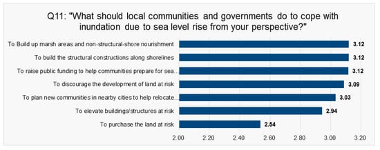 In order to understand citizens’ expectation on governments and communities, we created the following statements to investigate respondents’ opinions on adaptation options (Figure 6). The mean values of the statements suggest that residents prefer hard protection structures (3.12) and beach nourishment (3.12) to the other alternatives. The respondents also highly agree that governments should raise funds to address sea level rise issues (3.12). These are three top rated governmental responsibilities and reflect that people still want to rely on coastal defense systems and public funds in the face of sea level rise.