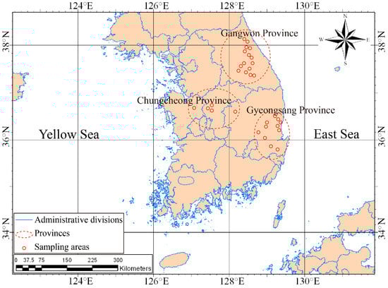 The study area includes Gangwon and Gyeongsang Provinces and Chungcheong Province in South Korea (Figure 1). CO2-rich groundwater and natural carbonated springs occur mainly in north-east Gangwon Province, north Gyeongsang Province, and in the Chungcheong Province []. The CO2-rich water emerges from natural springs in granitic areas of Gangwon and Gyeongsang Provinces and is extracted from deep wells for bathing in Chungcheong Province. The CO2-rich water occurs in sedimentary rock areas of Gyeongsang Province, unlike Gangwon and Chungcheong Provinces [].