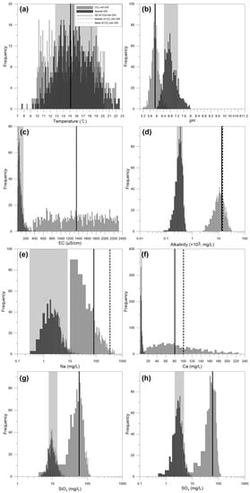 Probability density distributions of major parameters of CO2-rich (gray) and ordinary (dark gray) groundwaters in the Gangwon Province. (a) Temperature, (b) pH, (c), EC, (d) Alkalinity, (e) Na, (f) Ca, (g) SiO2, (h) SO4.