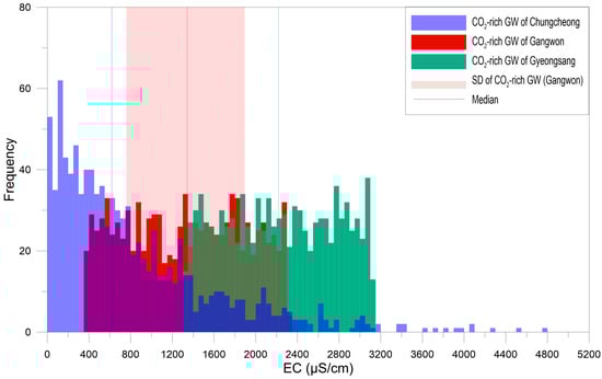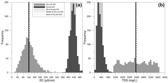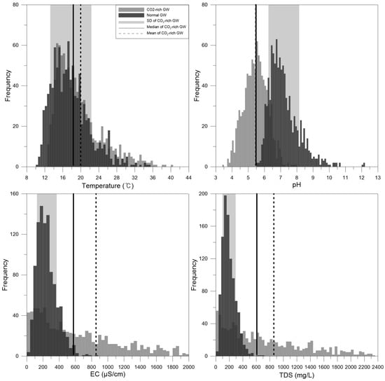 The temperature distribution is very similar, both quantitatively and qualitatively, whereas the pH distribution has identical shape but is shifted to the left due to lower pH in the CO2-rich groundwater than in the ordinary groundwater. The distributions and the statistical values of TDS and EC were identical between the CO2-rich and ordinary groundwaters based on the correlation between TDS and EC (Figure 4).