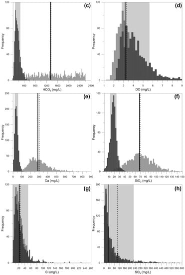 Probability density distributions of major parameters of CO2-rich (gray) and ordinary (dark gray) groundwaters in Gyeongsang Province. (a) EC, (b) TDS, (c), HCO3, (d) DO, (e) Ca, (f) SiO2, (g) Cl, (h) SO4.