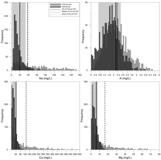 Na+, Ca2+ and Mg2+ show a similar tendency between the CO2-rich and ordinary groundwaters. In this case, the median concentration is often located between the lower and upper limits of one standard deviation of the background values. Therefore, it is better to use the mean instead of the median for distinct quantitative identification when the tail (normally right side) of the probability distribution extends in one direction. Even though the probability distribution of K+ in the CO2-rich groundwater shifts slightly to the right (i.e., the direction of high concentration), those of the CO2-rich and ordinary groundwaters cannot be distinctly distinguished, neither qualitatively nor quantitatively (Figure 5).