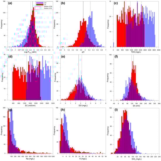 Comparison of probability density distributions of CO2-rich groundwater for Gangwon (GW, blue) and Gyeongsang (GS, red) Provinces. (a) , (b) pH, (c), TDS, (d) EC, (e) DO, (f) Eh, (g) Na, (h) K, (i) SiO2.