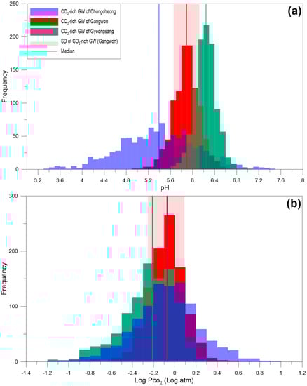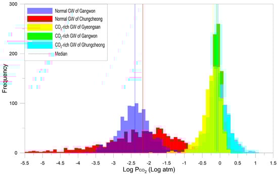 The PCO2 threshold between CO2-rich and ordinary groundwaters in the three study areas is 10−0.79 atm, with a confidence interval of 97.4%. The comparison of CO2-rich and ordinary groundwaters in the three study areas showed that the median values of pH of the CO2-rich groundwater are such that Chungcheong < Gangwon < Gyeongsang, while the median values of PCO2 of the three areas are very similar.