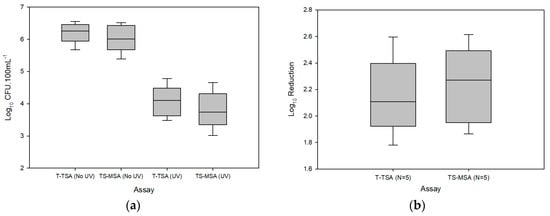 Hand-rinse bacteria exposed to 256 nm UV-C irradiation: (a) Log10 CFU·100 mL−1 on TSA (T-TSA) and total staphylococci on MSA (TS-MSA) before and after exposure to dose of 220 mJ·cm−2 (N = 5); (b) Log10 reduction on T-TSA and TS-MSA (N = 5).