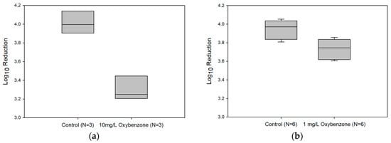 The collimated UV beam procedure described above was performed using S. aureus (ATCC 25923) to determine the effects of a sunscreen, oxybenzone, on the performance of UV inactivation. Oxybenzone was used as a test compound due to the relatively high concentrations (reports as high as 0.7 mg·L−1) when compared to other UV filters/sunscreens []. Since the source of oxybenzone in municipal wastewater is likely from greywater, oxybenzone and other micro-pollutant/PCP concentrations would likely be higher in greywater than in municipal wastewater (which is diluted by blackwater). As shown in a 2005 study by Palmquist and Hanæus [], organic compound pollutants were typically in greater concentrations within greywater samples when compared to blackwater and sometimes an order of magnitude higher in concentration. Therefore an oxybenzone concentration range of 1 mg·L−1 to 10 mg·L−1 was used due to the expected increase of oxybenzone concentration in greywater. Oxybenzone was dissolved into dimethyl sulfoxide (DMSO) (166.7 µL·L−1) and pipetted into sterile 0.85% NaCl buffer at two different concentrations: 10 mg oxybenzone·L−1 and 1 mg oxybenzone·L−1; DMSO was suspended into two separate buffer solutions (at 166.7 and 16.67 µL·L−1 for the two solutions respectively) used as controls to adjust for any confounding effects of DMSO on the reduction of S. aureus by UV irradiation. Overnight cultures of S. aureus (ATCC 25923) suspended in TSB were suspended into the four samples (10 mg oxybenzone·L−1, 1 mg oxybenzone·L−1, and respective controls) and irradiated to a UV-C dose of 11.8 mJ·cm−2 using the previously described collimated beam apparatus protocol. Samples were assayed on TSA plates in at least triplicate prior to and after exposure to UV. Log10 reductions were quantified using Equation (2). A paired t-test was performed between oxybenzone and respective controls on the log10 reduction means.