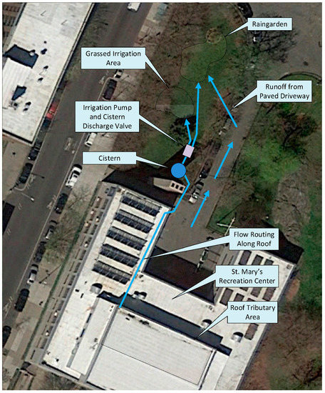 An advanced rainwater harvesting system (ARHS) that will be operated using CMAC was designed at the St. Mary’s Recreation Center (“the site”), located in the Bronx River sewershed (BRS) of New York City. The ARHS was designed to collect (or harvest) rainwater from the roof of the recreation center and store the water in a cistern for on-site use, including irrigation use. Specifically, the harvested rainwater in the cistern was to be available for irrigation of a grassed area adjacent to a proposed raingarden. The raingarden was designed to collect runoff from an adjacent driveway area in addition to controlled discharge from the cistern. The combined design plans for the ARHS and raingarden were approved by the New York City Department of Buildings (New York, NY, USA) on 28 February 2017 [10]. Figure 1 provides a schematic overview of the system’s design.
