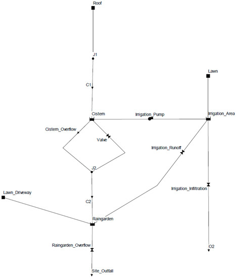 A hydrologic and hydraulic model of the site was developed using the Environmental Protection Agency’s (EPA’s) Stormwater Management Model (SWMM) version 5.1. SWMM is a dynamic rainfall-runoff simulation model and was chosen for use in this study instead of other commonly used models such as HydroCAD for its capability to effectively simulate long-term (continuous) runoff quantity from urban areas while implementing complex logic controls. The runoff component of SWMM operates on a collection of subcatchment areas that receive precipitation and generate runoff. The routing component of SWMM transports this runoff through a system of pipes, storage units, and other features [11]. Refer to Figure 2 for a schematic view of the SWMM model for the system design shown in Figure 1.