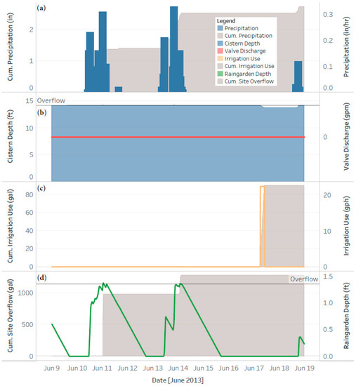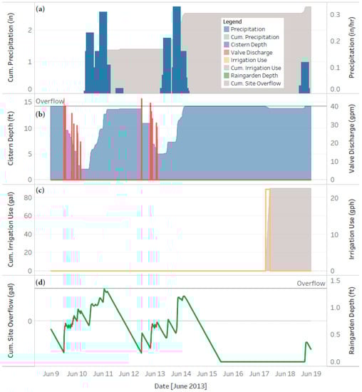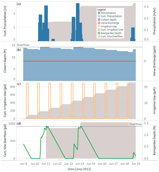 Timed Scenario Performance (9 June 2013–19 June 2013): (a) Rainfall occurred on 10 June 2013 and 13 June 2013; (b) The cistern’s water level decreased daily from scheduled irrigation, but overflowed to the raingarden during both rainfall events; (c) Scheduled irrigation occurred each day, including during rainfall; (d) The raingarden overflowed to the site outfall during both rainfall events despite beginning each event empty.