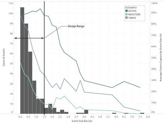 When examining results on a per event basis, the Active Scenario cistern is simulated to capture 85% to 93% of all roof runoff to the cistern, on average, for rainfall events smaller than or equal to 3.8 cm (1.5 inches) during the period of record (see Figure 6). The Active Scenario cistern is unable to capture all roof runoff for smaller events because of control logic rules reported by Table 3 such as the requirement to hold water for at least 12 h after a storm has passed. Performance expectedly decreases for larger, more infrequent, rainfall events.