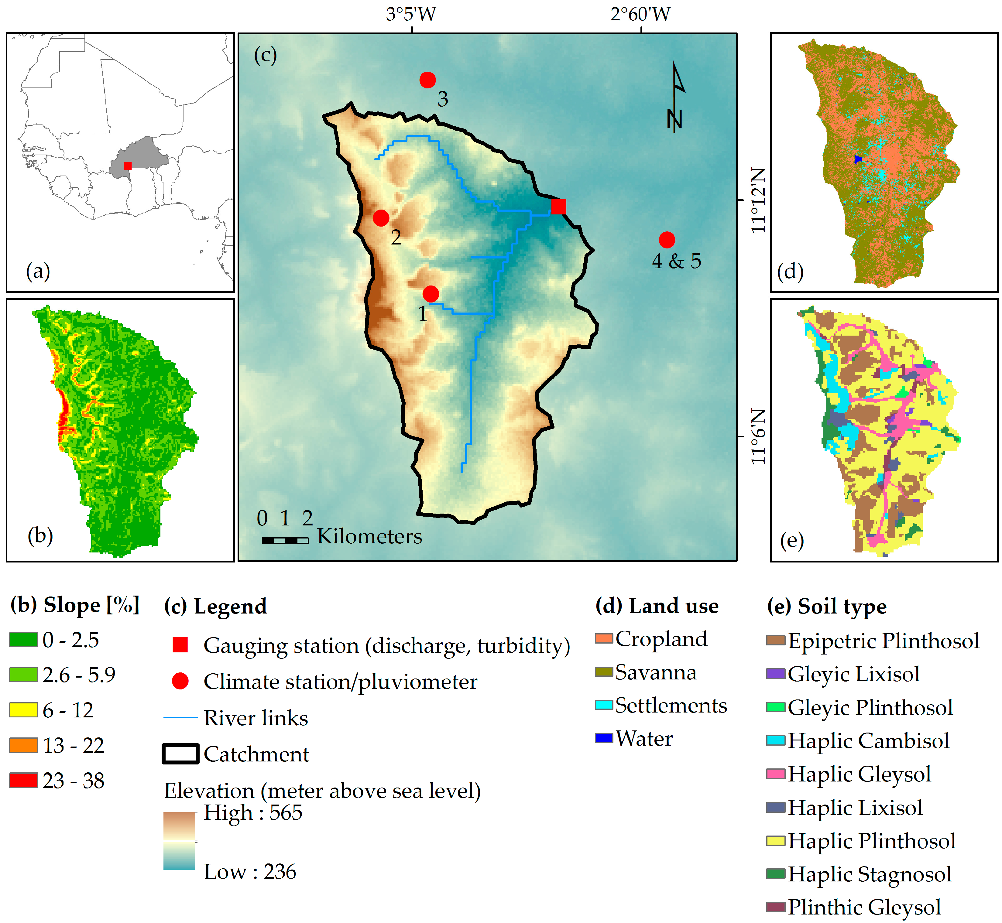 Location map of the Dano catchment: (a) location of the catchment and Burkina Faso in West Africa; (b) slope of the catchment; (c) model catchment; (d) land use map [53]; (e) soil map (data base: soil survey done by Ozias Hounkpatin, University of Bonn, Institute of Crop Science and Resource Conservation, Soil Science and Soil Ecology).