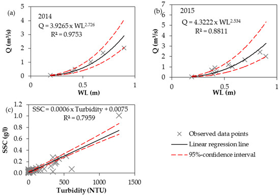 - Rasmussen, P.P.; Gray, J.R.; Glysson, G.D.; Ziegler, A.C. Guidelines and Procedures for Computing Time-Series Suspended-Sediment Concentrations and Loads from In-Stream Turbidity-Sensor and Streamflow Data; U.S. Geological Survey: Reston, VA, USA, 2009.