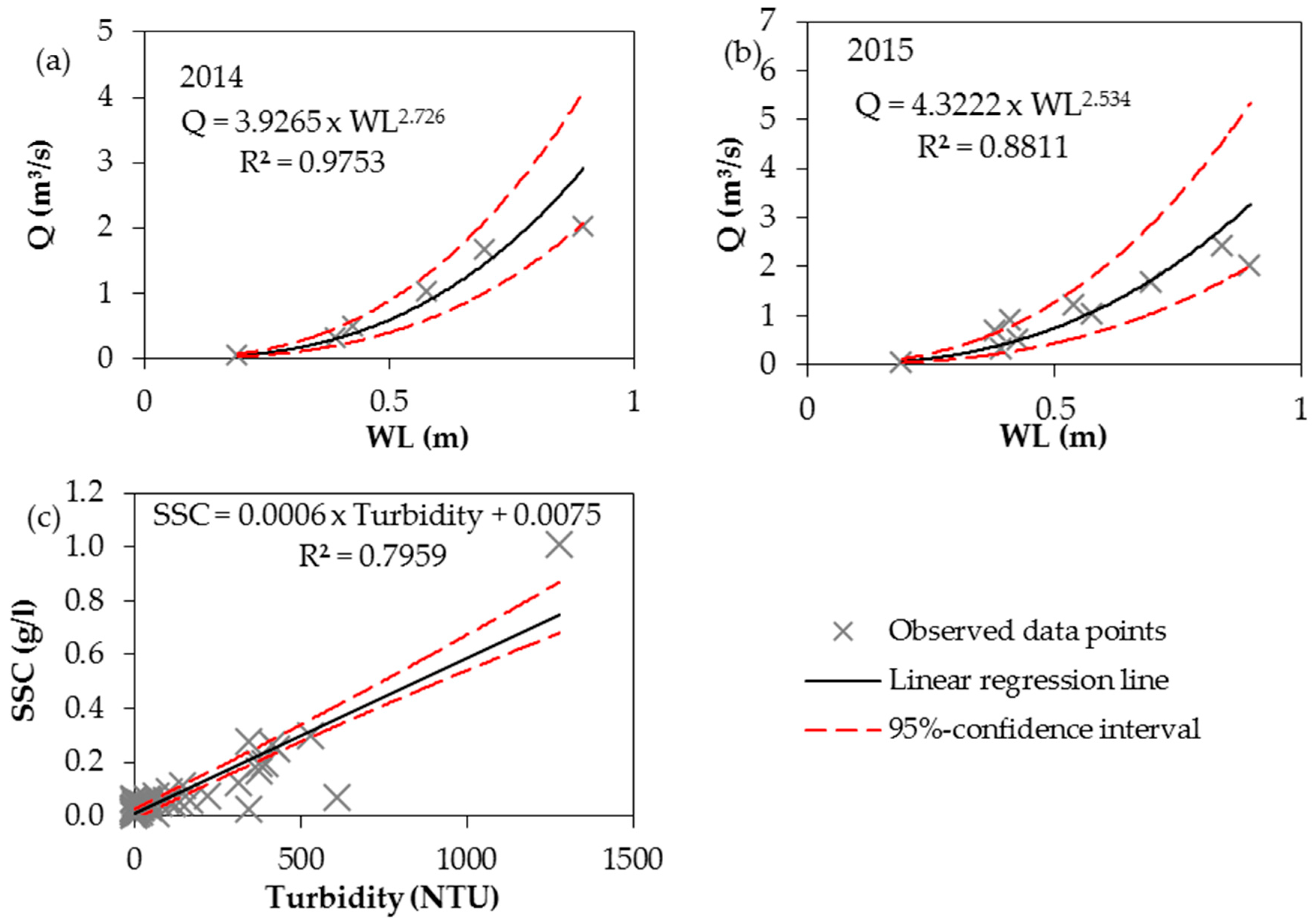 Scatter plots of recorded water level and measured water discharge for (a) 2014 (n = 6); and (b) 2015 (n = 10) and of (c) the recorded turbidity and measured suspended sediment concentration (SSC) (n = 57).
