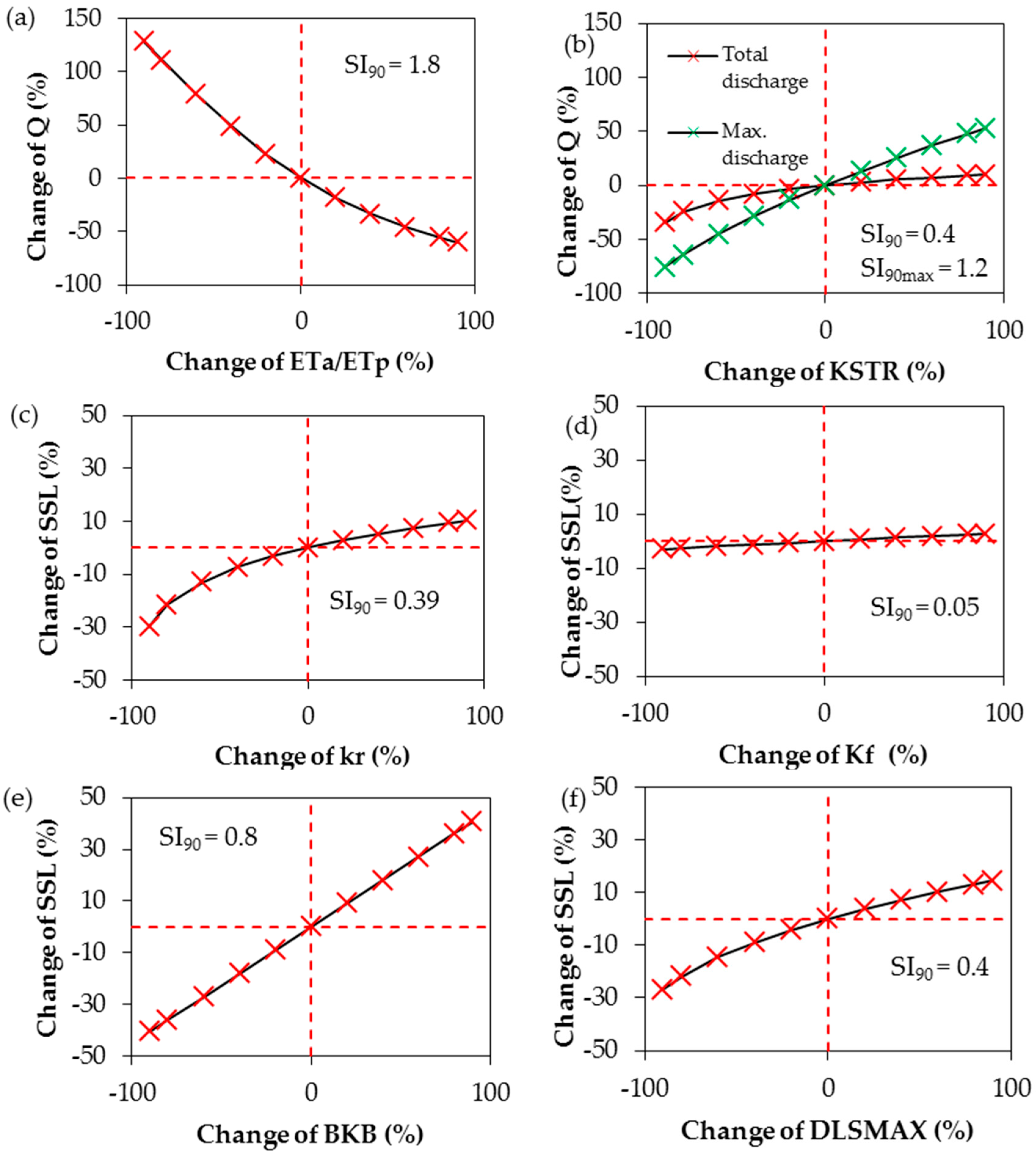 Scatter plots showing the sensitivity of water discharge Q to the ratio of actual to potential evapotranspiration (ETa/ETp) (a); and surface roughness (KSTR) (b); and the sensitivity of the catchment suspended sediment load (SSL) to the raindrop erodibility coefficient (kr) (c); the overland flow erodibility (kf) (d); the bank erodibility (BKB) (e); and the depth of loose sediment (DLSMAX) (f). Red dashed lines indicate the base run used for comparison. SI90max indicates the SI90 for the maximum discharge.
