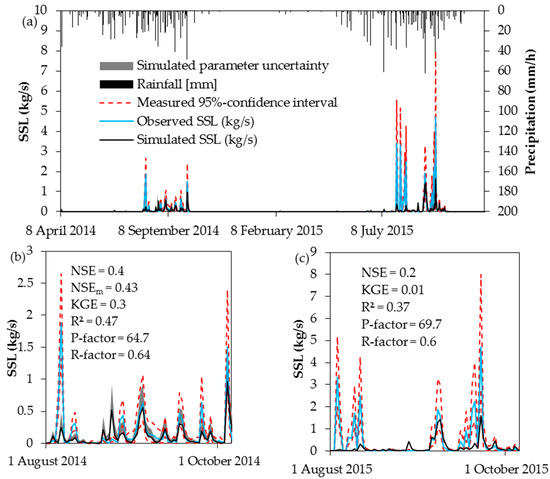 - The performance indices of simulated discharge are good (≥0.66) and comparable with other studies that used SHETRAN. Among these studies R2 and NSE values above 0.5 are frequently reported. However, SHETRAN often underestimates base flow which could be explained by the missing calibration of hydrological subsurface parameters. Some peaks were not well represented due to the differences between real and model spatial representation of rainfall. The performance indices of the simulated SSL are comparable with the few studies that used SHETRAN to simulate soil erosion and that indicated model performance. As the calculation of SSC is based on the relation between turbidity and sediment concentration, input of organic material into the river following the burning of crop residues and grassland may lead to high turbidity readings although the measured weight is low [91,92]. Thus, the mismatch between observed and simulated SSL at the start of the rainy season may also be explained by the method used to obtain the sedigraph.