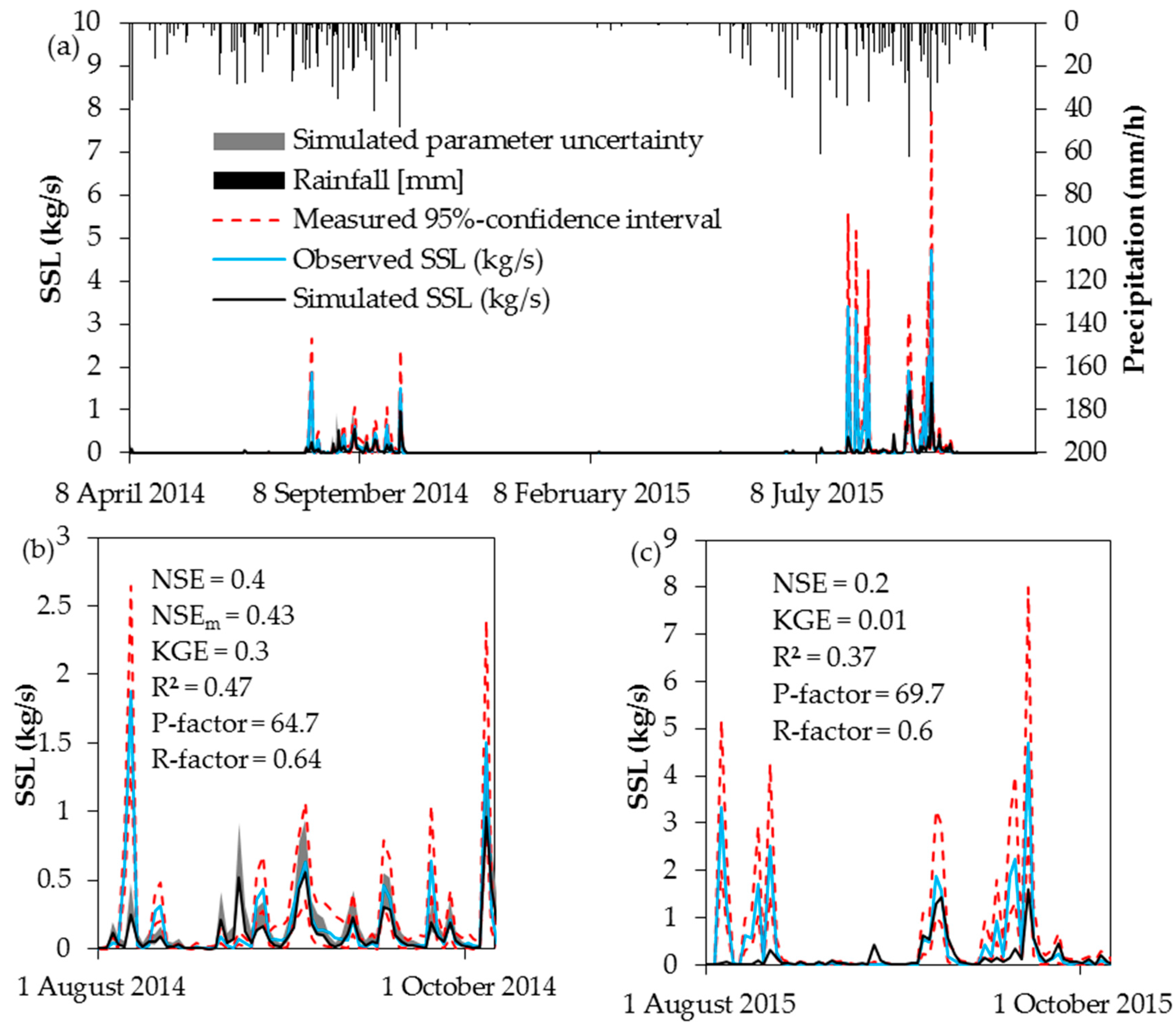 Figure 5 shows the simulated SSL having the highest sum of the performance indices for the calibration and validation period. The NSE is 0.4 and 0.2, the KGE 0.3 and 0.01 and the R2 is 0.47 and 0.37 for calibration and validation respectively. The NSE is in the range of other SHETRAN studies (see Table 2). However, few studies used the erosion component and if so performance indices are sometimes not reported. Other physically based erosion models may perform worse or better (−0.75 ≤ NSE ≤ 0.94) as shown by model comparison studies of de Vente et al. [8] and Pandey et al. [9] but a comparison with other models is difficult due to differences regarding the model setup (spatial/temporal scale) and the chosen output variable [8]. Given the various sources of measurement uncertainty a NSE of larger than 0.7 cannot be expected [8]. Nevertheless, it has to be noted that especially for the validation period, quality measures are not satisfactory. This may be related to the large differences between 2014 and 2015 regarding the observed SSL. The measured annual erosion rate in 2015 is almost three times higher than in 2014 whereas the simulated erosion rate is only 1.6 times higher in 2015. The simulated and measured annual sediment yield is 700 and 970 t for 2014, 1045 and 2725 t for 2015. Reasons for the differences between simulated and observed SSL may be the setting of the erosion parameters as some values are markedly different from those found in literature. However, an adjustment of erosion parameters to different conditions as discussed by Bathurst [57] is not possible during continuous simulations. Another reason may be the hourly timestep of the precipitation input which may be too long since erosion often occurs at sub-hourly periods.
