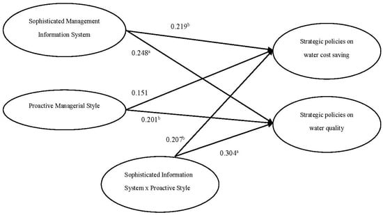 This paper analyzed the relationship between management information systems and managerial styles to implement water strategic policies. It was argued that the interaction between sophisticated management information systems and proactive managerial styles has a different effect on the achievement of water strategic policies, focused on cost saving and quality enhancement. This paper tried to improve our understanding of managerial styles as a key variable that moderates the relationship between management information systems and multiple water strategic policies. The research findings can be summarized as follows. Sophisticated management information systems are positively related to water strategic policies towards both cost saving and quality enhancement. Thus, the adoption of sophisticated management information systems by hospitals can facilitate the achievement of multiple water strategic policies. Results also show that a proactive managerial style only has a positive significant effect on policies towards water quality enhancement. The findings show that proactive managerial styles moderate the relationship between sophisticated management information systems and water strategic policies focused on cost saving and quality enhancement. Results show that sophisticated management information systems under proactive managerial styles will facilitate more the adoption of strategic policies towards water quality enhancement rather than strategic policies towards cost saving. This is consistent with previous studies that argued that quality strategic policies are complex since they require cross-functional responsiveness to different demands and specific requirements, and thus they need flexible managerial styles to process and manage a comprehensive set of information from different services directed at improving workflows, prioritizing activities, and optimizing resource allocation [,].