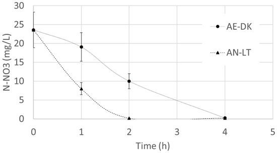 Nitrate depletion with time during NUR test for R. capsulatus grown in aerobic-dark (AE-DK) and anaerobic-light (AN-LT) conditions.