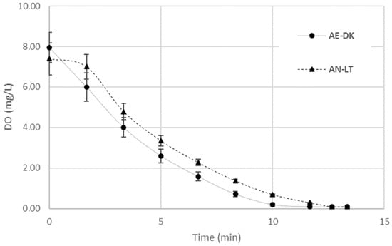 In the biotechnological field, microbial respiration is typically expressed as the oxygen uptake rate (OUR). Although OUR is a general term which does not presuppose any specific conditions in its determination, in the wastewater field it is usually reserved for on-line measurements of oxygen consumption through the measurement of the residual dissolved oxygen (DO). Indeed, OUR is often referred to as the dynamic respirometric index, as a measure of the aerobic degradation of organic material by aerobic microorganisms [30]. Furthermore, OUR can provide much information concerning the treatment plant’s performance, wastewater characteristics, the degradability of special concentrated streams as well as the parameters needed to predict possible optimizations of a treatment plant. The OUR measurements proved that the oxygen-depletion bioprocesses in mixed liquor are a necessary but not sufficient condition for nitrification [31]. Figure 4 shows the respirograms of mixed liquor with the addition of R. capsulatus as the inoculum, both in AE-DK and AN-LT growth conditions. The OUR measurements can be performed in various ways which have been described in detail [32]. In this case, tests were carried out by adding a readily biodegradable substrate such as acetate to avoid false-negative results. They could be caused by the excess of nitrogen due to the presence of human waste in the sludge, which could lead to an imbalance in the optimal COD:N ratio of 100:5 [33], or to the presence of inhibitory streams, or to an occurrence of endogenous, slowly biodegradable organic carbon. In fact, as it is well known while the carbon sources and oxygen have been consumed, DO progressively decreases due to the cells’ respiration. It is worthwhile to note that the oxygen was completely depleted in 45 min. In this case, as expected, the AE-DK-grown biomass seemed to be better adapted to the oxygen-rich environment, contrary to the AN-LT biomass which showed a lag phase before starting aerobic respiration (Table 1).