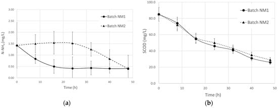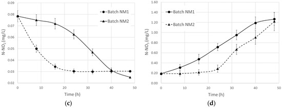 Under aerobic-dark conditions, aerobic respiration is the main catabolism pathway for organic matter degradation through the glycolysis, tricarboxylic acid cycle and electron transport chain process, whereas under anaerobic-light conditions, material catabolism pathways are glycolysis and the following fermentation, or anaerobic respiration [39]. In the first case, oxygen is the final electron acceptor and the initial matrixes can be completely mineralized to CO2 (oxidation tank conditions). In the latter, the final electron acceptors could be small products (fermentation) or nitrate (anaerobic respiration). In the nitrification tank (aerobic conditions, batches NM1 and NM2), N-NH3 was reduced by 70% in 50 h when both AE-DK and AN-LT biomass were added.