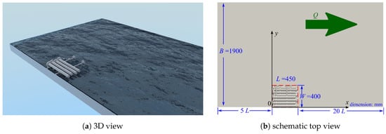 In this study, the ELJ flume experiments in [,] were simulated and analyzed. The water depth was 114 mm, and the flume width was 1900 mm. For numerical simulations, the 3D geometry of the ELJ structure was drawn in FreeCAD, as shown in Figure 1. The ELJ structure consisted of 18 key elements and four cross-spanning elements. The elements were cylinders with a disk on one head. The disks were 64 mm in diameter and 14 mm in thickness. For the key elements, the cylinder was 32 mm in diameter and was oriented towards the streamwise direction with the disk upstream. For cross-spanning elements, the cylinders were 19 mm in diameter and were oriented towards the spanwise direction with the disk in the center of the stream. The ELJ structure was fixed to the right bank. The total length of ELJ was mm, and the width was mm. The upstream length of the flume in the computational model was , and the downstream length was , as shown in Figure 1b.