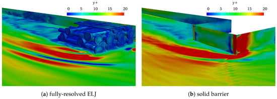Time averaged y+ distribution for the fully-resolved ELJ and the solid barrier.