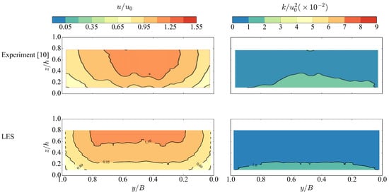 Comparison of the cross-sectional distributions of mean streamwise velocity and turbulent kinetic energy (TKE) between the numerical and experimental results for the background case without ELJ. The variables are made dimensionless with channel width B, water depth h and mean velocity .